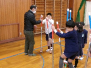 地域の方を学校にお招きして、1年生、2年生に、竹馬やこま回し、あやとりなどを教えてもらいました。